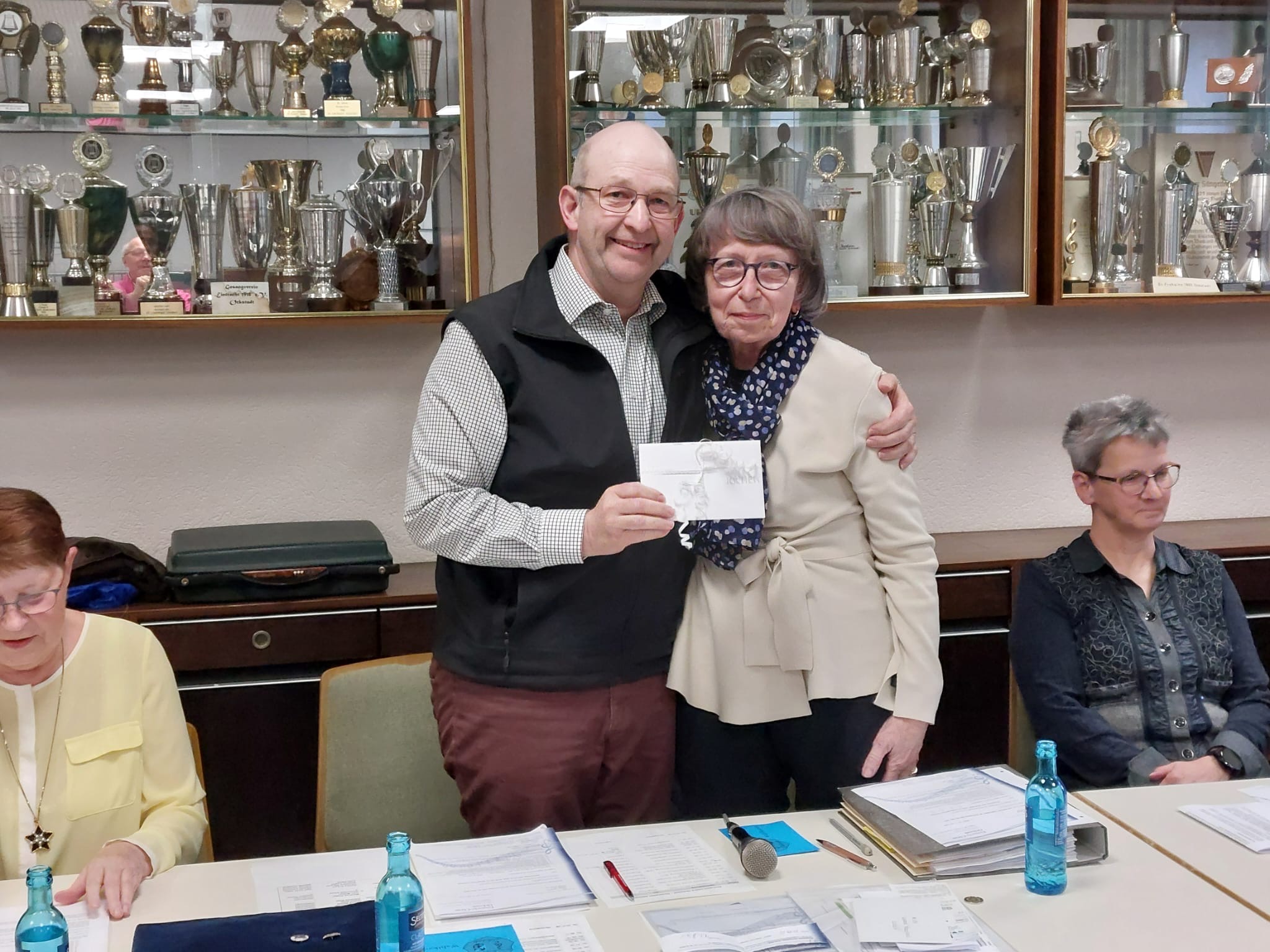 Jochen Albrecht ist seit 40 Jahren Mitglied im V orstand, davon 2 Jahre als Notenwart, 6 Jahre als 2.Vorsitzender und nunmehr seit 32 Jahren 1. V orsitzender und somit eine zentrale Figur im Verein, den er über diesen langen Zeitraum mit Herz und Hand leitet. Er ist der Motor des Vereins. Als Zeichen der Wertschätzung für seinen langjährigen und unermüdlichen Einsatz überreichte Helga Schaaf (Kassenführerin) Jochen Albrecht ein kleines Präsent als Dankeschön. Die Ehrung endete mit einem herzlichen Applaus der Anwesenden, die sich auf viele weitere Jahre voller gemeinsamer Aktivitäten und Erfolge freuen.